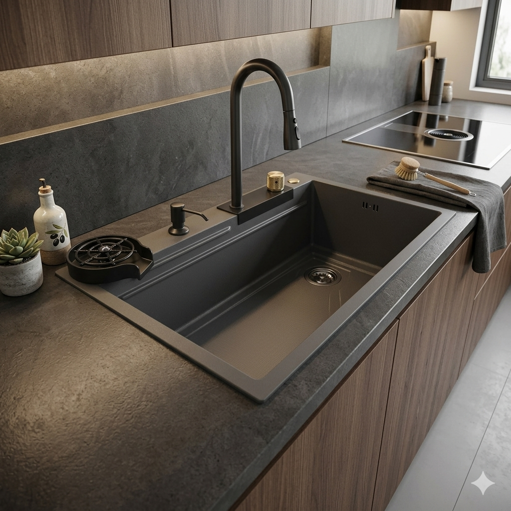 Feita de aço inoxidável 304 com tecnologia de ponta, esta cuba oferece uma resistência excepcional e proteção contra corrosão. Seu acabamento em preto fosco confere um toque de elegância moderna que se adapta perfeitamente a qualquer estilo de decoração de cozinha.