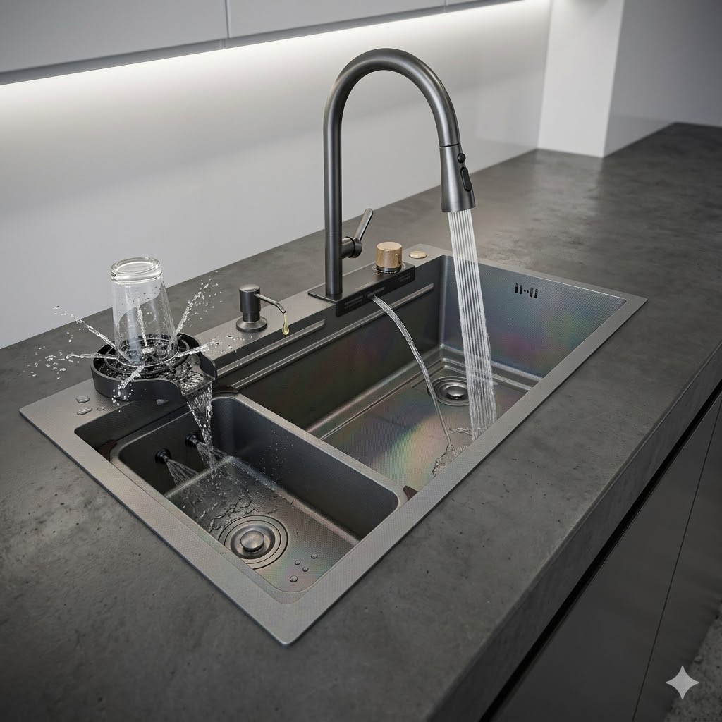 Apresentamos a Cuba de Cozinha Smart em Aço Inox com Cascata, uma adição indispensável para elevar o charme e a funcionalidade da sua cozinha. Desenvolvida com cuidado e utilizando materiais de alta qualidade, esta cuba proporciona uma experiência superior em todas as suas atividades diárias na cozinha.