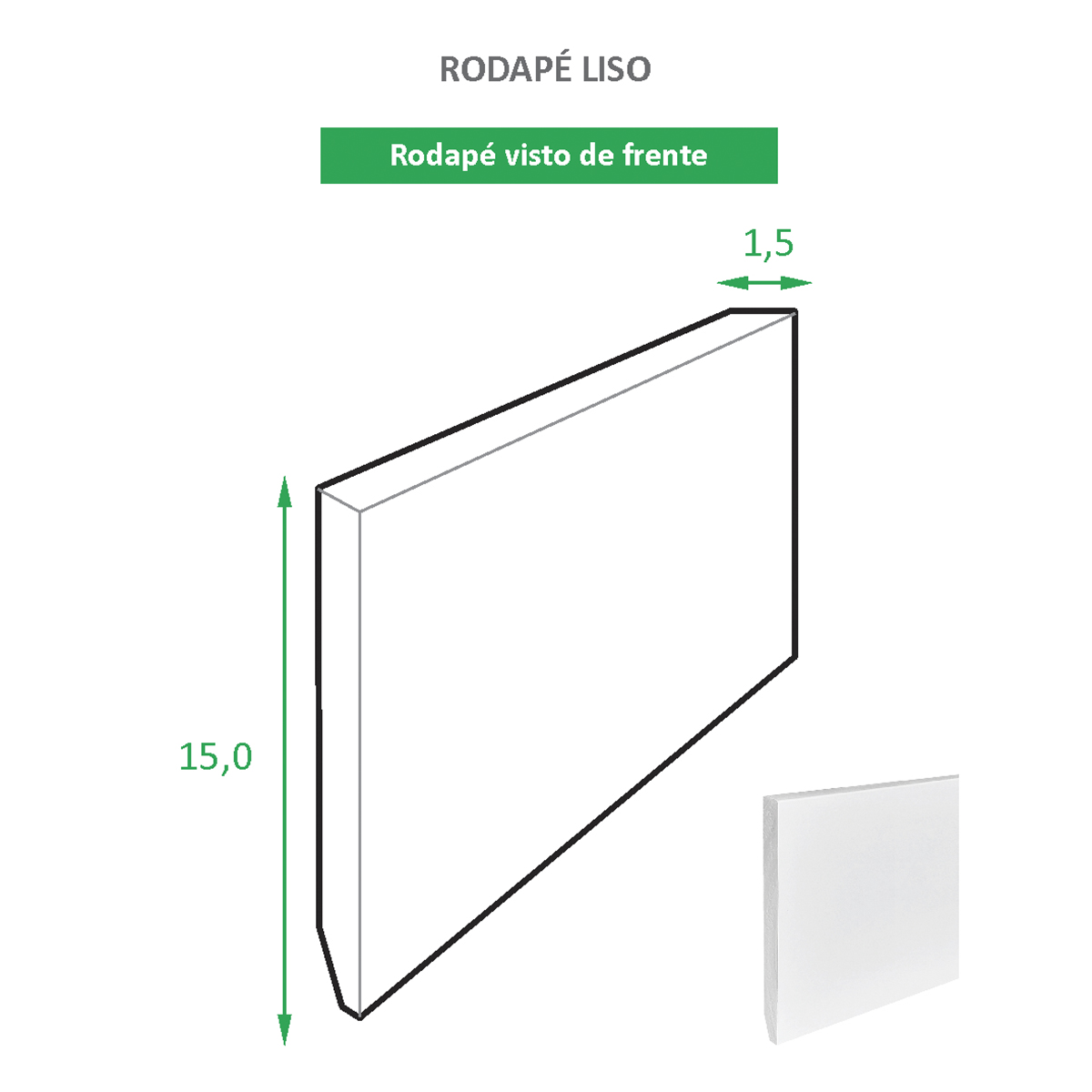 Com 15 cm de altura, 2,40 m de comprimento e 15 mm de espessura, a Rodapé Liso é imune a cupins, não mofa, não empena e já vem pronta para uso com acabamento laqueado que dispensa pintura.